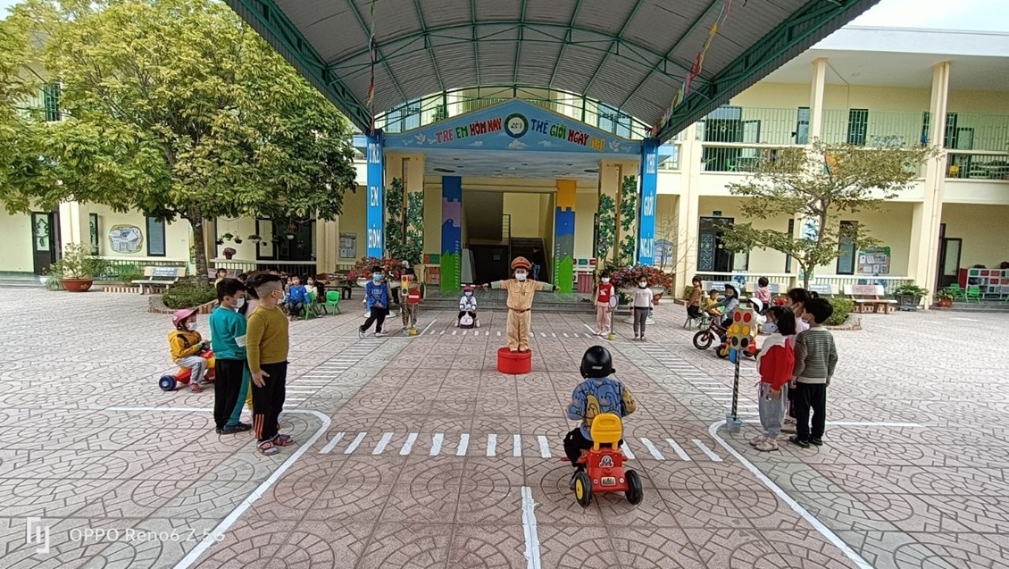 Hòa chung với không khí chương trình “Tôi yêu Việt Nam”, đầu năm học 2022-2023 ban giám hiệu nhà trường đã xây dựng kế hoạch chuyên đề “Tôi yêu Việt Nam” gửi các lớp để đưa vào kế hoạch năm học của lớp mình và thực hiện. Trước khi triển khai, giáo viên các khu trường đã thực hiện thiết kế sân chơi giao thông cho trẻ và một số đồ dùng dụng cụ như biển báo, đèn tín hiệu giao thông… ngoài ra trên sân trường còn dán các apick, hình ảnh… trên bảng tuyên truyền ngoài sân trường để tuyên truyền với các bậc cha mẹ trẻ về an toàn giao thông trong trường học: không đi xe vào sân trường mà phải để xe trên vỉa hè, phải đội mũ bảo hiểm cho mình và cho con khi đi học trên đường…