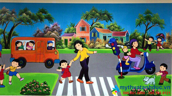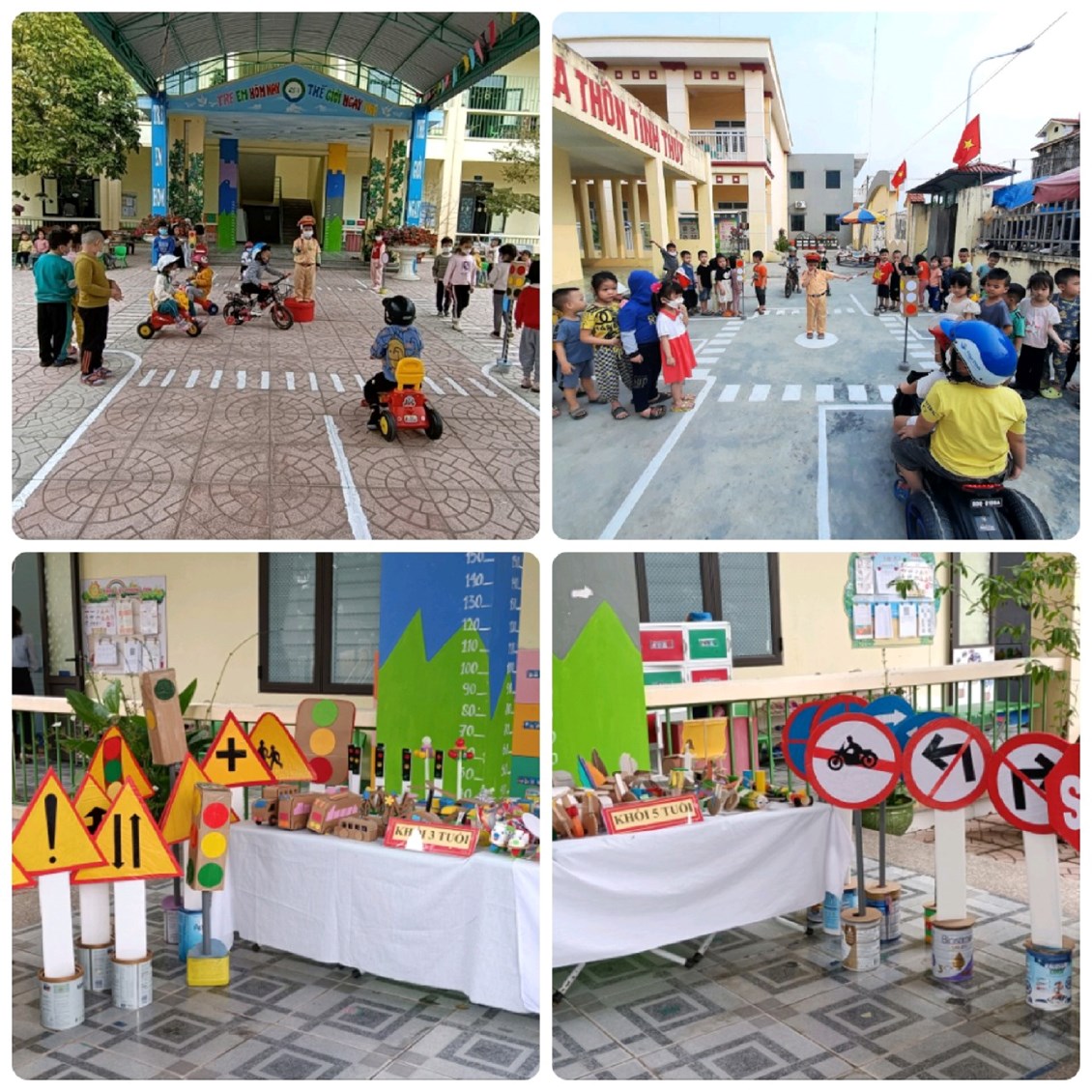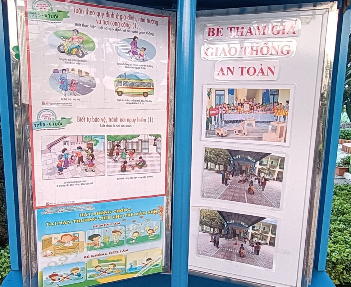 Với bài học “Bé tìm hiểu về luật lệ an toàn giao thông” ở các lớp mẫu giáo 5 tuổi, cô sẽ dạy cho trẻ biết đâu là vỉa hè, đâu là lòng đường, người đi bộ phải đi trên vỉa hè, người đi xe phải đi dưới lòng đường. Khi đến ngã tư, người đi bộ phải qua đường đúng làn đường quy định. Khi qua ngã tư có tín hiệu đèn giao thông phải nhìn tín hiệu đèn: đèn đỏ phải dừng lại, đèn vàng thì chuẩn bị, đèn xanh mới được đi. Ngoài ra các cô còn cung cấp cho trẻ nhận biết một số biển báo như biển cấm đi ngược chiều, cấm rẽ phải, cấm rẽ trái, các biển cảnh báo nguy hiểm, các biển chỉ dẫn, đèn tín hiệu giao thông… Cách đi bộ trên đường, cách đi trên phương tiện giao thông thế nào cho được an toàn, dạy trẻ nhận thấy được hậu quả của các hành động vi phạm luật lệ an toàn giao thông. Ngoài ra nhà trường còn tổ chức hội thi “Thiết kế sáng tạo bộ giáo cụ các PT giao thông”. Sau khi triển khai thực hiện hội thi các lớp của các khu trường đã thiết kế được rất nhiều các mô hình PTGT, mô hình biển báo giao thông. Qua hội thi còn giúp trẻ có thêm hiểu biết về luật an toàn giao thông, ngoài ra hội thi còn tuyên truyền được tới các bậc cha mẹ trẻ trong việc mang xe đạp, ô tô của trẻ đến trường, để trẻ có thêm các phương tiện, đồ dùng đồ chơi tham gia sân chơi giao thông. Từ sân chơi giao thông này trẻ học cách đi đúng làn đường, không được rẽ vào đường có biển cấm, biết đóng chú cảnh sát giao thông chỉ dẫn đường cho các phương tiện lưu thông đúng luật, giải quyết một số vi phạm luật giao thông của người đi đường, từ đó giúp trẻ có những hành vi thói quen tốt trong chấp hành luật giao thông.