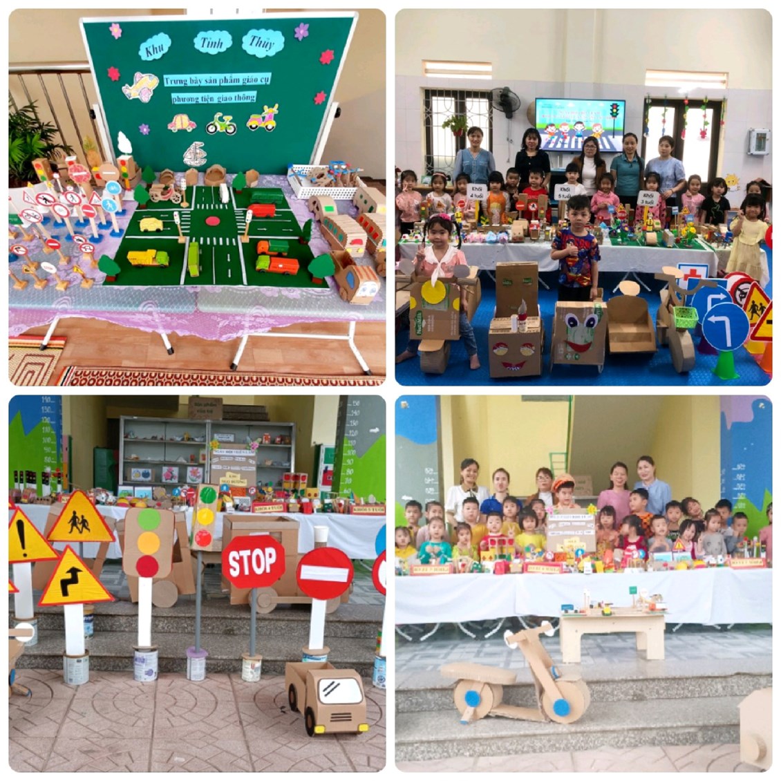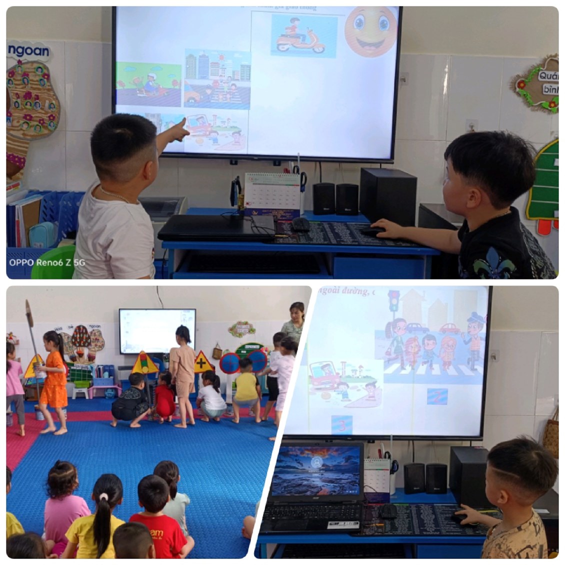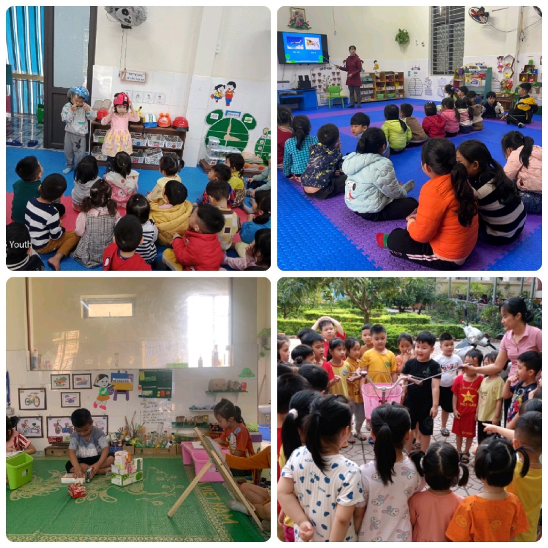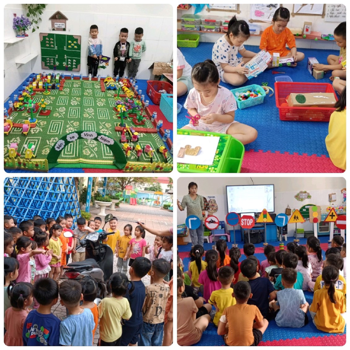Để trẻ nắm bắt và nhớ được các luật lệ an toàn giao thông, trong chương trình GDMN các lớp đã lồng ghép một số hoạt động tìm hiểu khám phá các PTGT như: tìm hiểu phân loại về xe đạp, xe máy, xe ô tô, tìm hiểu về các loại thuyền, tàu, phân loại PTGT theo nơi hoạt động… Hàng ngày các bé được tham gia vui chơi trong hoạt động góc và tự tay mình sáng tạo, hay thiết kế ra các loại PTGT, biển báo giao thông theo ý tưởng của trẻ với góc hoạt động Steam làm ô tô, làm thuyền…, hay chơi xây bến đỗ xe, ngã tư đường phố, bến cảng… Khi bé được chơi với các đồ dùng đồ chơi các PTGT, biển báo giao thông mà bé tự tay làm, tự sáng tạo ra, chính điều đó giúp cho trẻ khắc sâu thêm kiến thức về luật lệ an toàn giao thông tốt hơn. Ngoài ra trẻ còn được tham gia chơi một số trò chơi chọn tranh về những hành vi đúng sai khi tham gia giao thông được thiết kế trên máy vi tính, trong các hoạt động góc, hay xem các tập phim “Vui giao thông” vào các buổi đón trả trẻ, các buổi chiều trong ngày và ở nhà trên đường link hay mã quét QR cô đã gửi trên nhóm zalo của lớp.