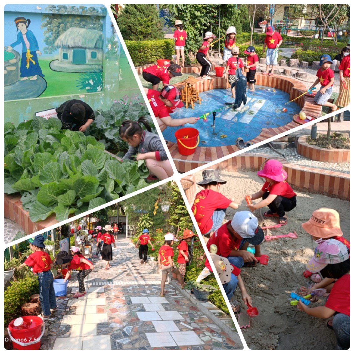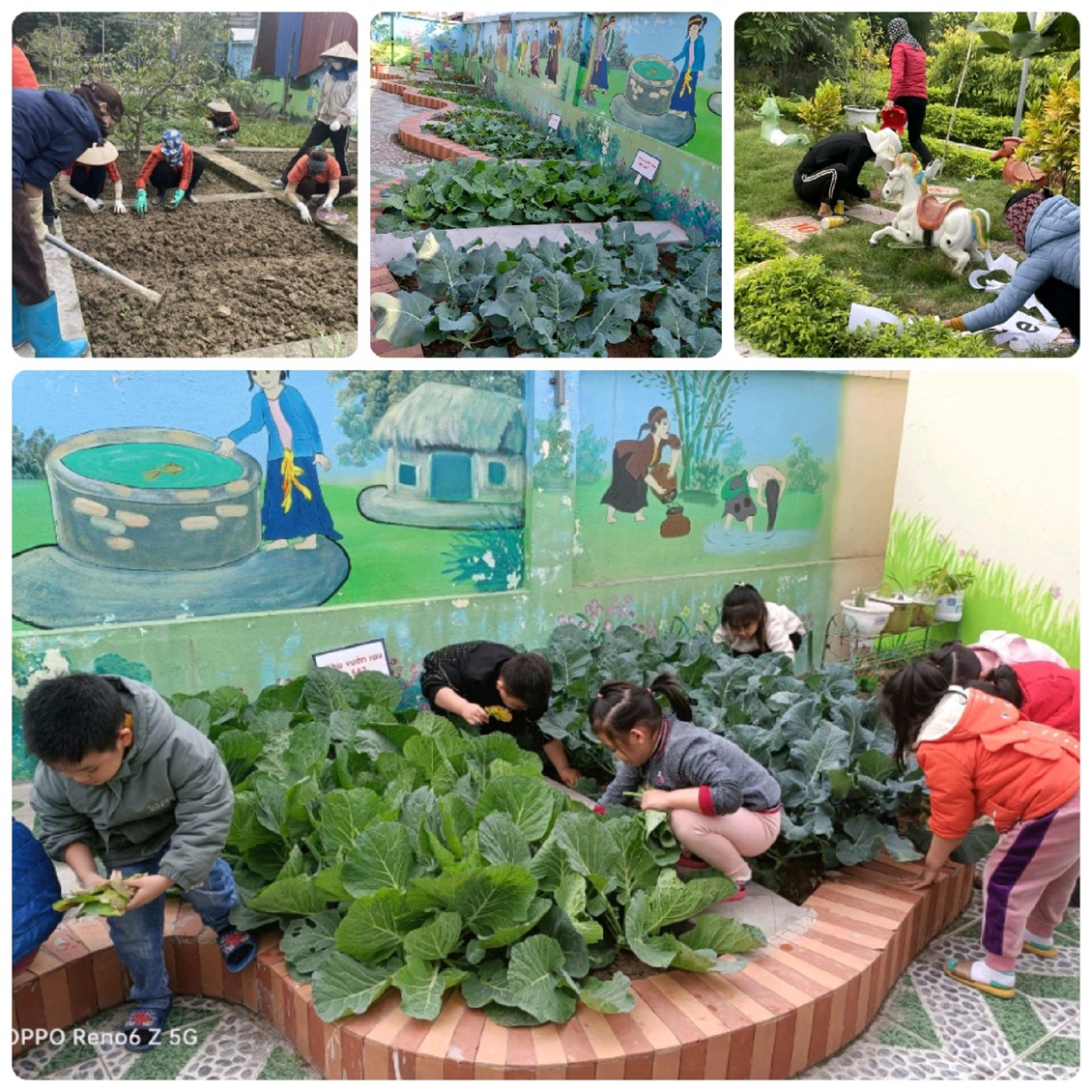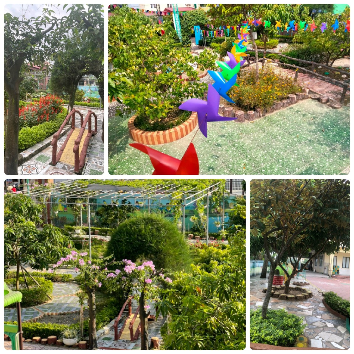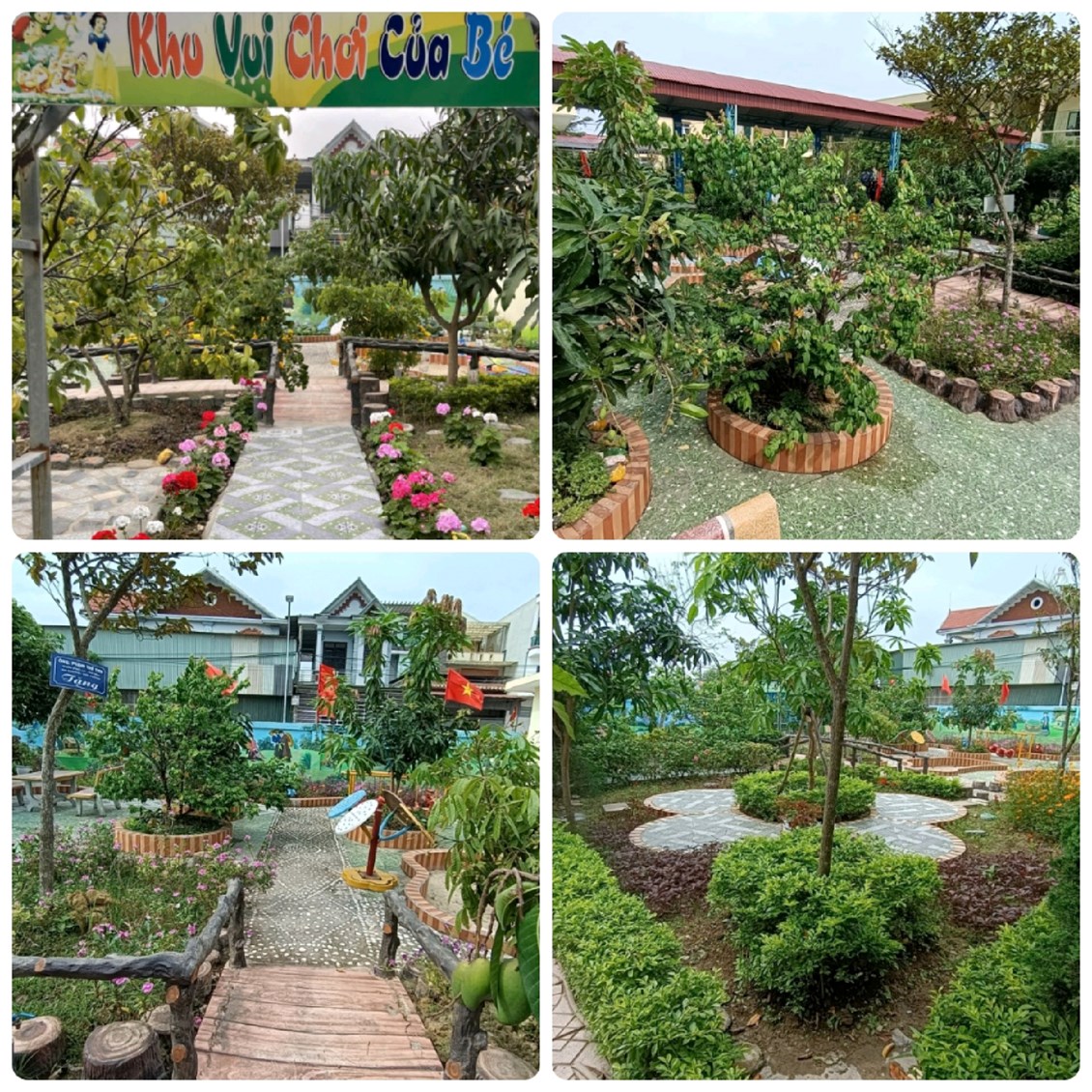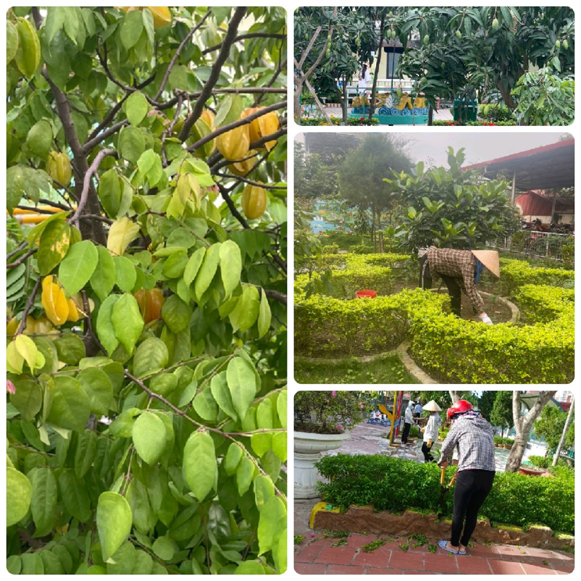 Để tạo cho trẻ có một môi trường vui chơi học tập ngoài trời thoải mái mát mẻ, an toàn, thân thiện đẹp mắt. Ban giám hiệu nhà trường, Ban chấp hành công đoàn đã tổ chức cho đoàn viên công đoàn tham gia lao động, xới cỏ, trồng hoa, vườn rau, cây cảnh, khơi thông cống rãnh, phun thuốc khử trùng…cắt tỉa bớt cành và chăm sóc cây xanh, cây ăn quả. Đồng thời kết hợp cùng phụ huynh học sinh trồng thêm cây bóng mát, cây cảnh trên sân trường. Đến nay các cây xanh, cây cảnh nhờ vào sự chăm sóc của cô và trẻ trong trường đã xanh lên xanh tốt. Một số cây ăn quả trong vườn trường như: Xoài, nhãn, khế... đã ra hoa kết quả cho trẻ những buổi tham quan, quan sát vui chơi ngoài trời gần gũi, thiết thực và bổ ích.