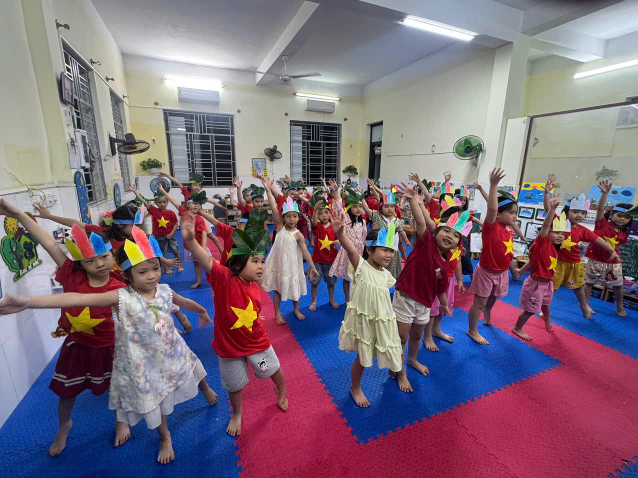 Hoạt động này không chỉ giúp trẻ rèn luyện kỹ năng tạo hình, sự tỉ mỉ mà còn giúp các con hiểu hơn về hình ảnh các Vua Hùng trong lịch sử dân tộc. Khi được đội những chiếc mũ do chính tay mình làm ra, các bé vô cùng thích thú và tự hào.